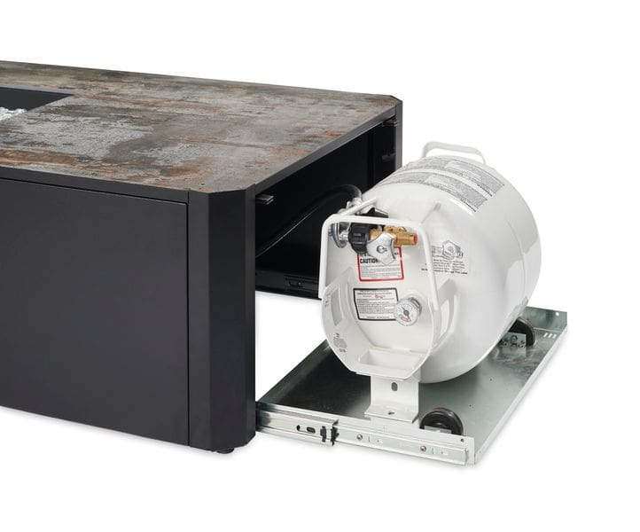 The Kinney Fire Pit Table features an ultra-modern design that is perfect for entertaining. The low-profile base meets a contemporary top to ensure your focal point is the main attraction on your patio. Extra tabletop space makes it convenient for entertaining guests. Gather everyone around the 12” x 24” Crystal Fire® Plus burner for a cozy, relaxing time.